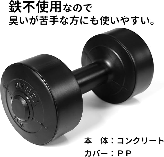 プラスチックカバーの一体型ダンベルです。 鉄不使用なので、鉄臭くなく、鉄の臭いが手に付く事もありません。
