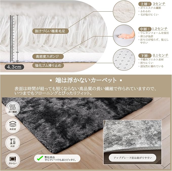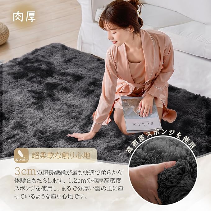 Beddiny カーペット ラグ ラグマット 洗えるラグ【中層:極厚30D高密度ウレタン 独自技術の抗菌防臭加工】絨毯 オールシーズン快適に使用 滑り止め付き 高密度シャギーラグ ブラック グレー 120 160cm