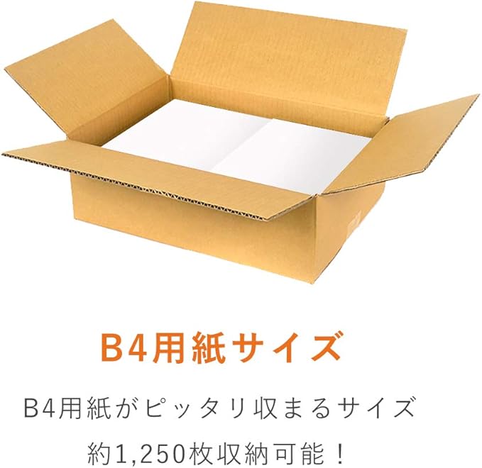 B4コピー用紙やB4チラシを1,250枚程度梱包、B5サイズの場合は、1,250枚 2列で2,500枚程度梱包可能です。