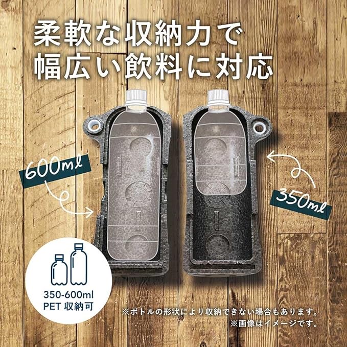 ボトルの構造を利用した収納方法で350~600mlまで幅広いサイズのペットボトルが収納できる。※ボトルの形状によっては収納できない場合もあります。