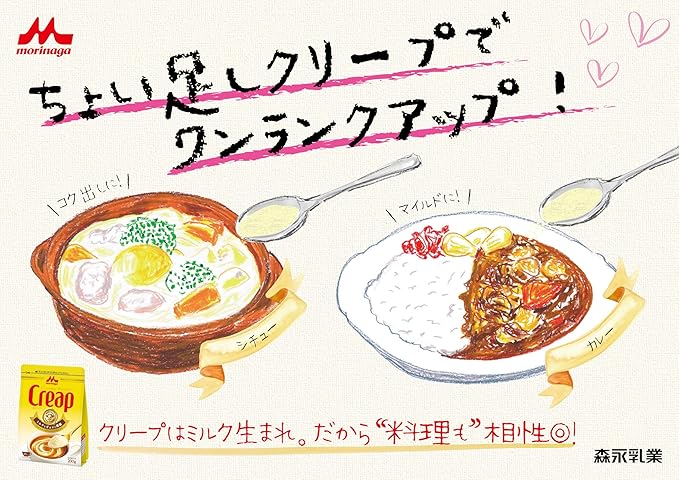 森永クリープは、日本で唯一、ミルクから生まれた成分を原料にしたクリーミングパウダーです(※2023年7月時点 森永乳業調べ)当社独自の技術によって、香料や着色料を使わない製法を実現しています。だから、安心してお使いいただけます。便利なスティックタイプ。豊かなコクがコーヒーの美味しさをより一層引き立てます。牛乳から生まれた成分で出来ているので、温かいコーヒーを冷まさずに楽しむことができます。その他にもお菓子やカレー、シチューのコク出しなど幅広く使えます。コーヒーポーション・ミルクポーションの代わりに。