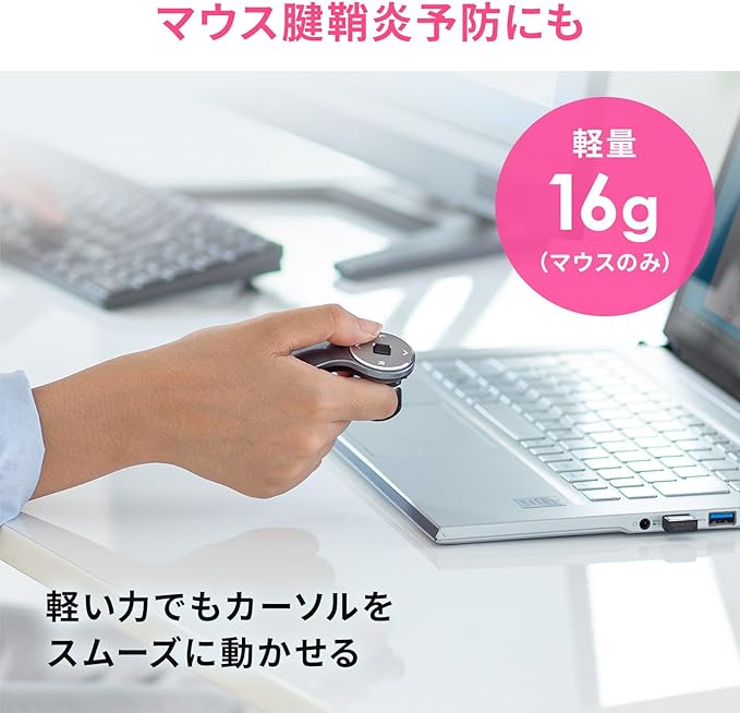 指輪の様にはめておくだけなので、リングマウスを付けたまま、キーボード操作や他の作業もできます。