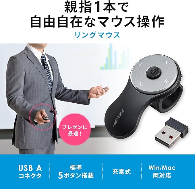 指に装着して親指で操作できるワイヤレスリングマウスです。