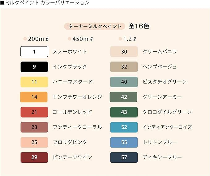 【特長】 ■アメリカ開拓時代、ミルク原料(ミルクガゼイン)を利用した塗料で、家具などを彩色していました。その柔らかい色調が現在も好まれ、森永乳業のミルク原料を使用したターナーミルクペイントが生まれました。アーリーアメリカのやわらかい色調で、乾けば美しい落ち着いた仕上がりに。 ■水性で取扱いも簡単です。 ■1本で1㎡~1.5㎡(2回塗り)が目安です。