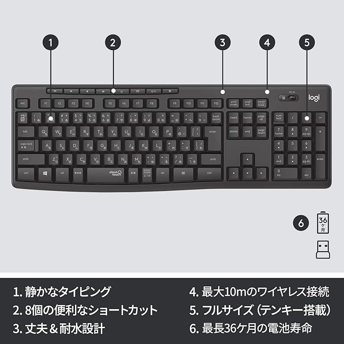 従来モデルより90%の操作音を削減した静音キーボードとマウスのセットが登場。ロジクール独自の新技術SilentTouchテクノロジーを採用したこの静音キーボードとマウスのセットはタイピング感覚やクリック感覚はそのままに、静かな場所でも人を気にせず作業することができます。 キーボードは8つのショートカットキーとテンキーを搭載したフルサイズの日本語配列キーボード。キーボードの上に水をこぼしても安心な耐水設計で、キースイッチは耐久性に優れています。 裏面には8度の傾斜をつけられるスタンド付き。タイピングがしやすくなっています。また、柔らかな丸みのシルエットのマウスは持ちやすいコンパクトサイズ。滑らかで精確なクリックとポインティング、静かなクリック音を実現しています。 接続はUSBレシーバーに対応。2.4GHzワイヤレス接続で最大10mの接続範囲に対応し、混雑したワイヤレス環境でも途切れにくくなっています。 オン/オフスイッチ付きの省エネ設計。キーボードは最長36ケ月、マウスは最長18ケ月の長電池寿命も魅力のキーボードとマウスのセットです。 対応OS:Windows7以降、Chrome OS