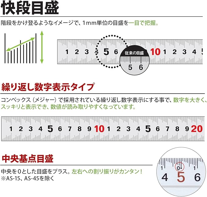 中央を0とした中央基点目盛で左右への寸法割り振りも簡単です。