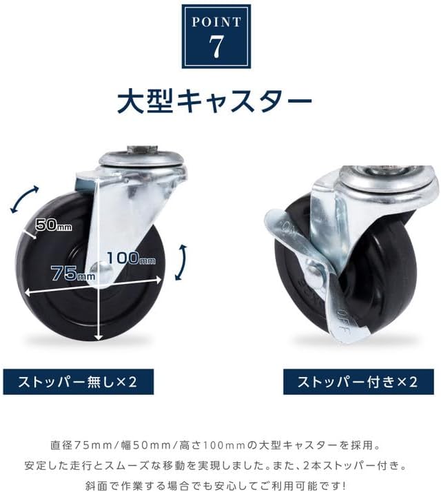 【耐荷重約200kg&スムーズな移動】 ステンレス製作業台のキャスターは360 回転可能なため、作業台を自由自在に動かすことができます。大型のキャスターは、直径75mm、幅50mm、高さ100mmの仕様で設計されており、安定した走行を可能にします。さらに、2本のキャスターにはストッパーが付いており、斜面での作業中も安心してご利用いただけます。狭いスペースでも容易に方向転換ができ、作業の流れを途切れさせることなく効率的に進められます。