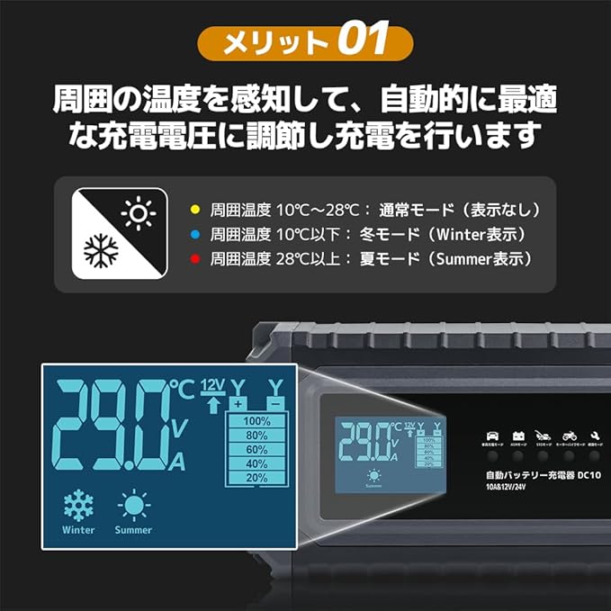 LVYUAN(リョクエン)自動「パルス充電」バッテリー充電器 定格10A 緊急時全自動 スマートチャージャー 12V/24V対応 バッテリー診断機能付 AGM/GEL車充電可能 バイク ・自動車・農機・建設機械・小型船舶など 日本語説明書 DC-10 温度感知モード 冬満充電を確保