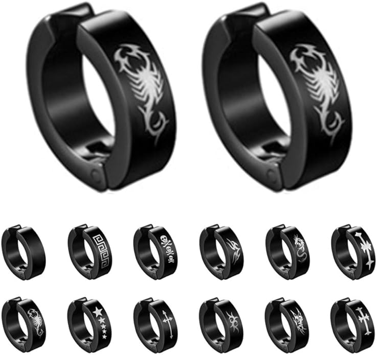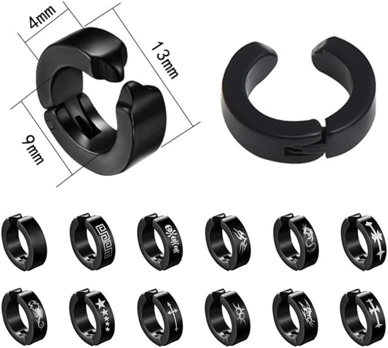 YOLOOメンズ ノンホール フープピアス シンプルリング イヤーカフ フェイクイヤリング 金属アレルギー対応 サージカルステンレス製 ブラック 十字架 髑髏 星 人気柄12種YL-56 (スタイル10)