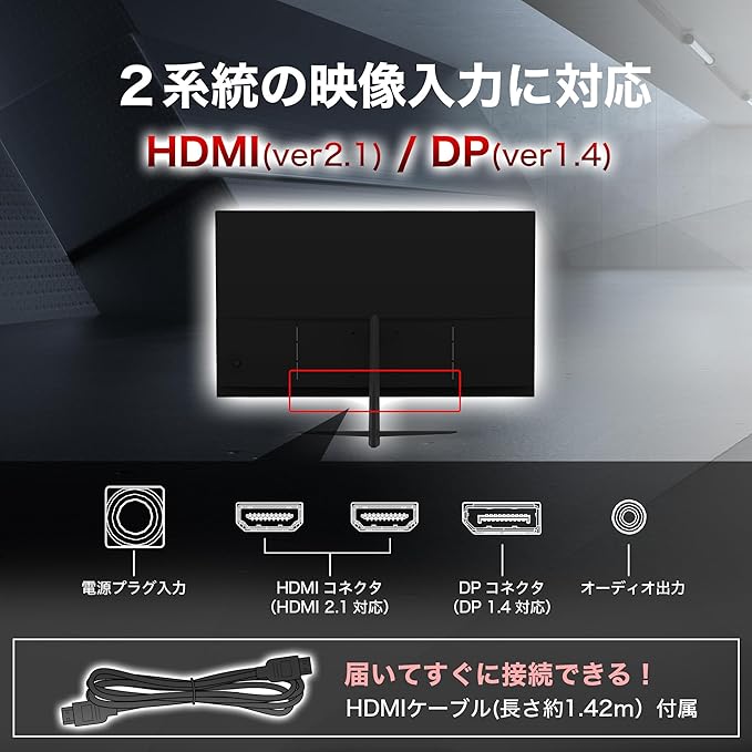 ☑️【HDMI 2ポート搭載】 豊富なインターフェース / ケーブルホルダー HDMI 2ポートとDPを搭載しており複数の対応機器を接続可能です。HDMIケーブル付属で、お手元に届いてすぐに接続ができます。さらに付属の着脱可能ケーブルホルダーがケーブル類をすっきりまとめます。