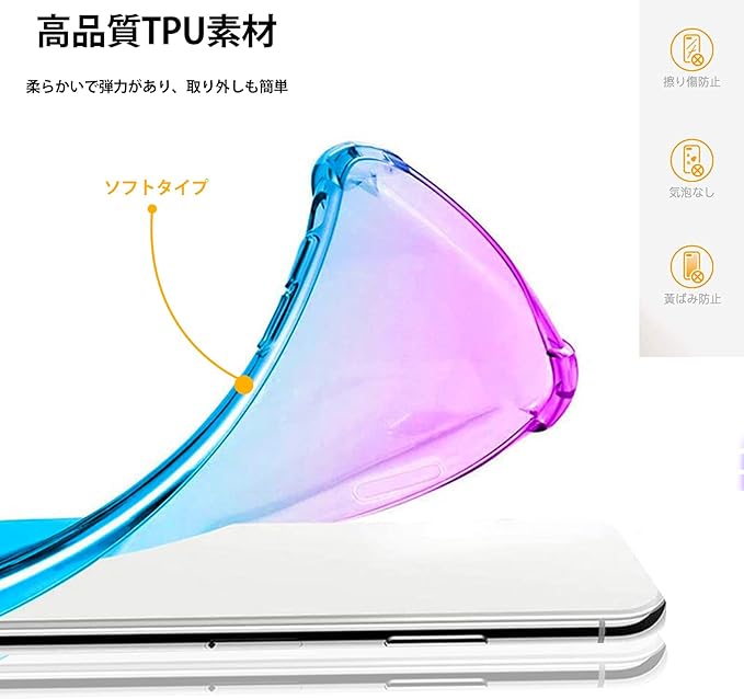 ◆【グラデーションの外観】背面部分は透明で、背面部分にグラデーション美しさとシャープさがMIXされたスッキリデザイン。透明度が高く、携帯電話本体の美しさを完璧に見せます。わずか0.5mmの極薄軽量デザインで、持ち運びに便利、長く持っても手が疲れる感じもありません。まるでケースを付けていないかのような質感。