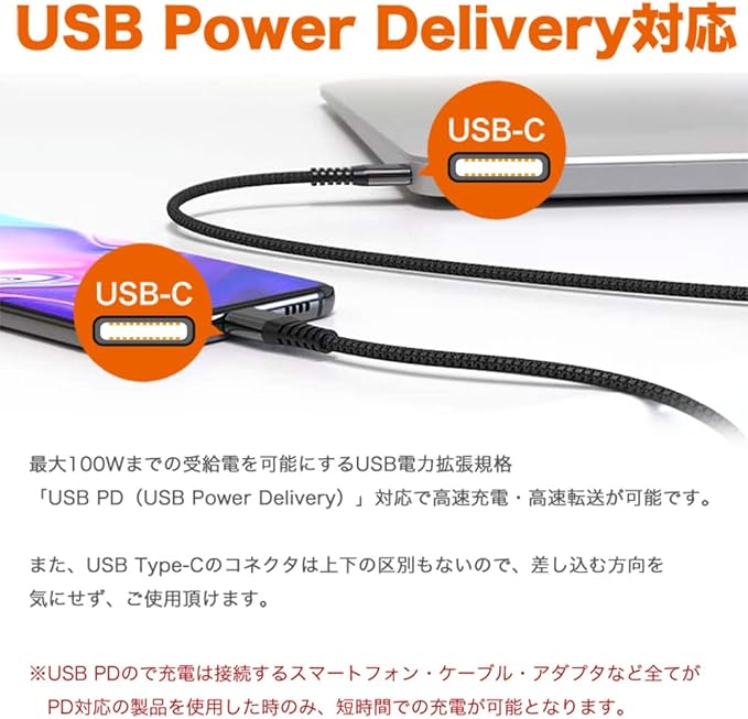 高速充電は充電機器、アダプタ両方ともPD対応機器をご使用ください。 PD対応の製品を使用したときのみ、短時間での充電や転送が可能となります。