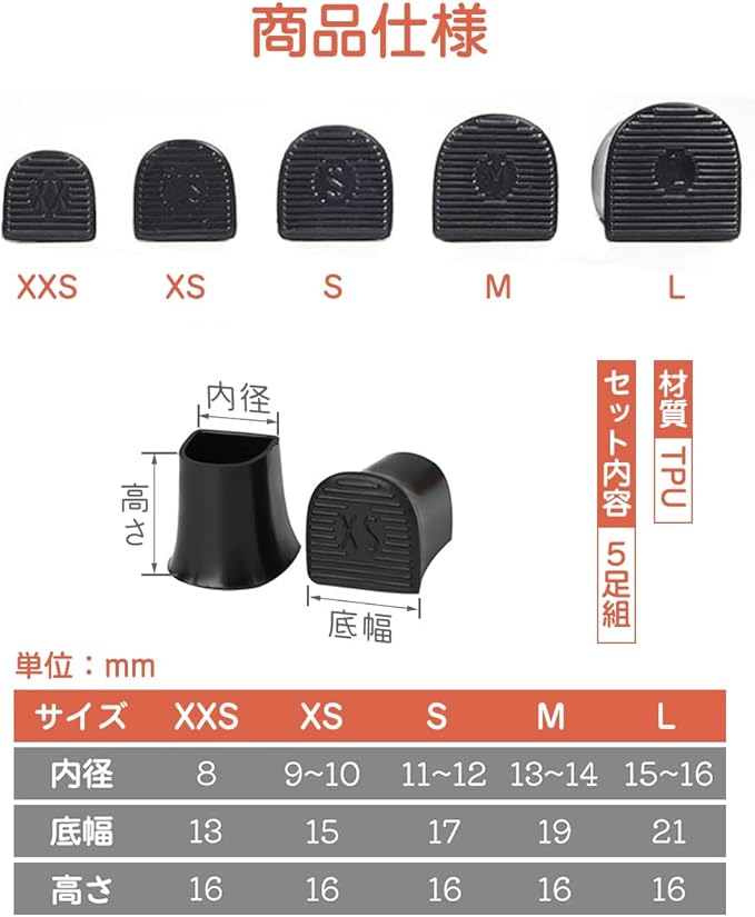 XXS、XS、S、M、Lの5サイズをご用意しております。サイズごとのご購入も可能で、さまざまな靴にフィットし、異なるシーンでの保護ニーズに対応します。