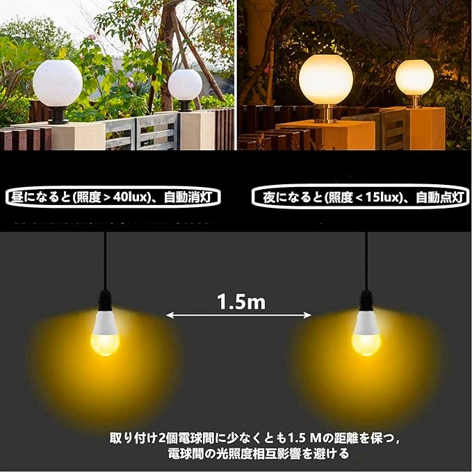 明暗センサー搭載付:内蔵された光センサーモジュールが外部照度を検知して、ライトのオン・オフを自動調節できます。(人体検知機能なし)
