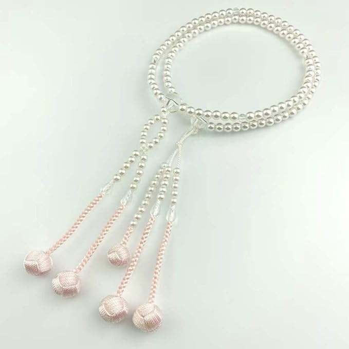 国際創価学会(SGI)用専門数珠です、 女性向けののMサイズ。 ABS樹脂に特別なパール色塗装をほどこし、とても美しいパールの輝きを実現しました。親玉と四天には透明なアクリル製玉が入って、オシャレです。 房は、灰桜/白2色手毬房を採用させて頂きました。丈夫で扱い易く、型崩れを起こさない手毬房、長い使用は可能です。