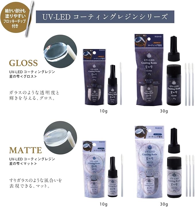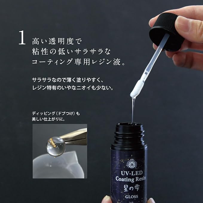 硬化が早く、硬い仕上がりで、硬化後のベタつきがない。ガラスのような透明度と輝きを与える、グロスタイプ。