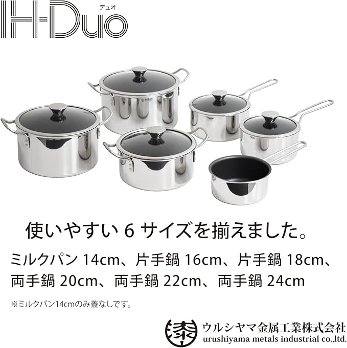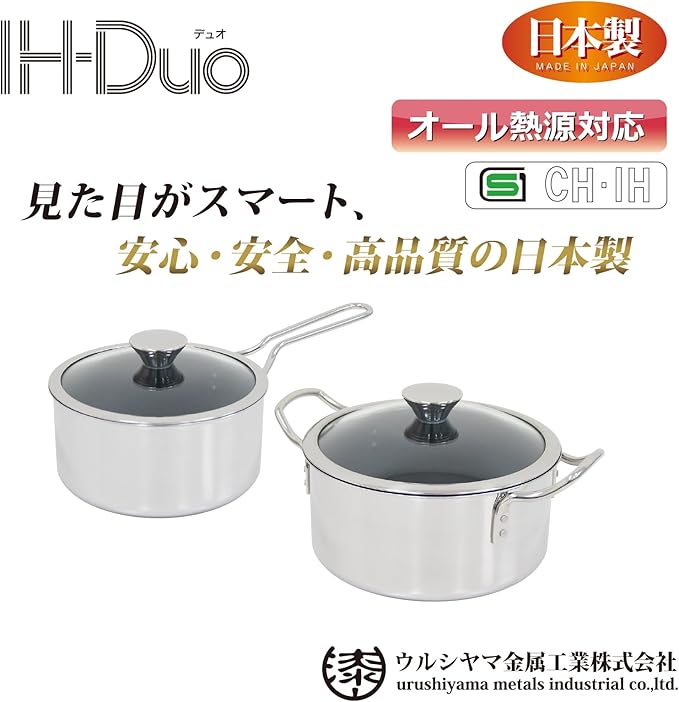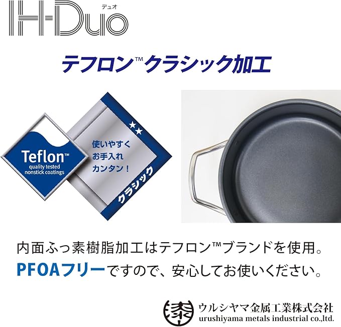 ウルシヤマ金属工業 両手鍋 20cm 内面フッ素樹脂加工で汚れが落ちやすい 時短 ガス・IH対応 内面テフロンクラシック加工 全面2層構造 日本製 SG製品 IHデュオ PFOAフリー DUO-20W 深型 卓上鍋 ステンレス製