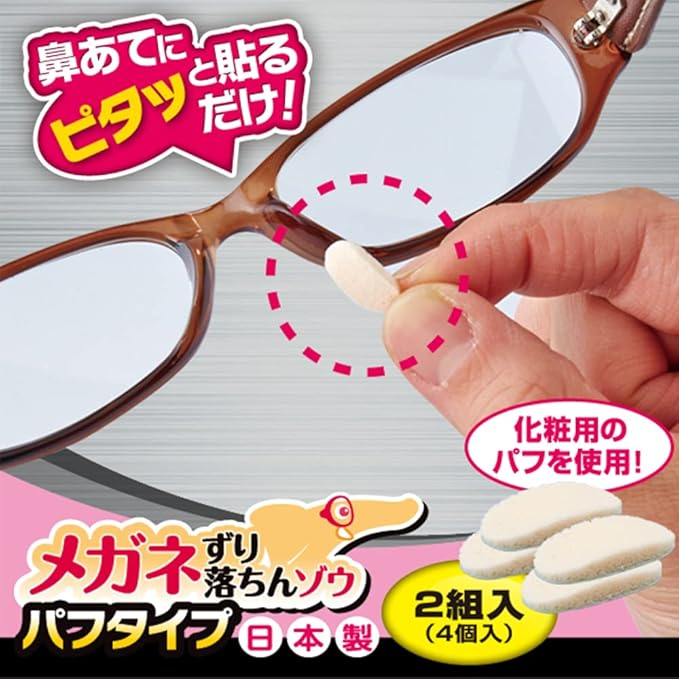化粧用のパフを使用。こんもり丸~い形で、メガネがズレにくい! 鼻あてにピタッと貼るだけ! パフタイプでやさしくフィットします。化粧くずれや眼鏡のズレ落ちが気になる方に。鼻を高くしたい時は、二重に重ねて使えます。セルフレーム、メタルフレーム、サングラスなどいろんなメガネに。