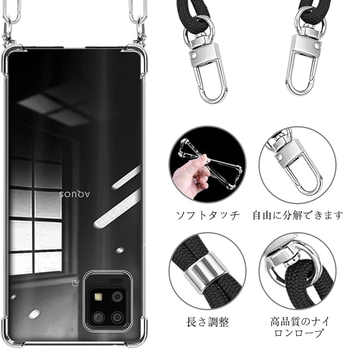 AQUOS Zero6 ケース ショルダー クリア SHG04 スマホケース SH-RM18 カバー ストラップ付き 肩掛け 斜めかけ シャープ ゼロ6 縄掛けケース TPU 薄型 軽量 取り外し可能 落下防止 【透明】