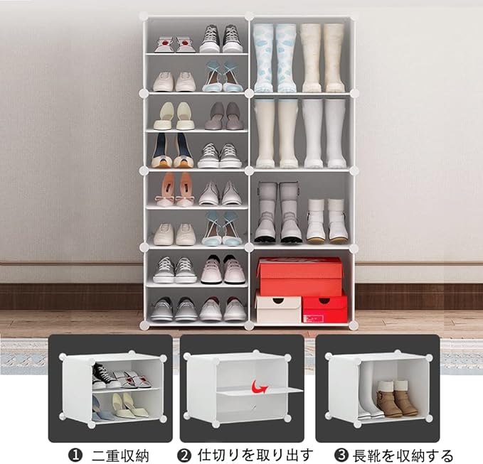 ★ 【省スペース&大容量】サイズ: 44cm(幅) 32cm(奥行) 158cm(高さ)材質:本体/樹脂、柱/厚鉄パイプ。18 ~ 20足まで対応できます。ルービックキューブはそれぞれ二重構造になっていて、間の仕切りが取り外し可能になっているため、ブーツやハイヒールなどを収納できるスペースがあり、バッグやシューズボックスなどを収納できます。