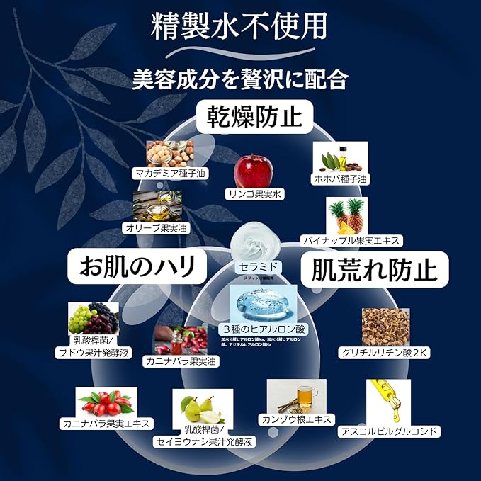 特別な原料 リンゴ果実水、BG、グリセリン、ベンチレングリコール、加水分解ヒアルロン酸Na、加水分解ヒアルロン酸、アセチルヒアルロン酸Na、グリチルリチン酸2K、カンゾウ根エキス、カニナバラ果実エキス、パイナップル果実エキス、乳酸桿菌/ブドウ果汁発酵液、乳酸桿菌/セイヨウナシ果汁発酵液、アスコルビルグルコシド、スクワラン、スフィンゴ糖脂質、カニナバラ果実油、ホホバ種子油、マカダミア種子油、オリーブ果実油、クエン酸Na、ポリアクリル酸Na、セルロースガム、トコフェロール、フェノキシエタノールリンゴ果実水、BG、グリセリン、ベンチレングリコール、加水分… 表示を増やす