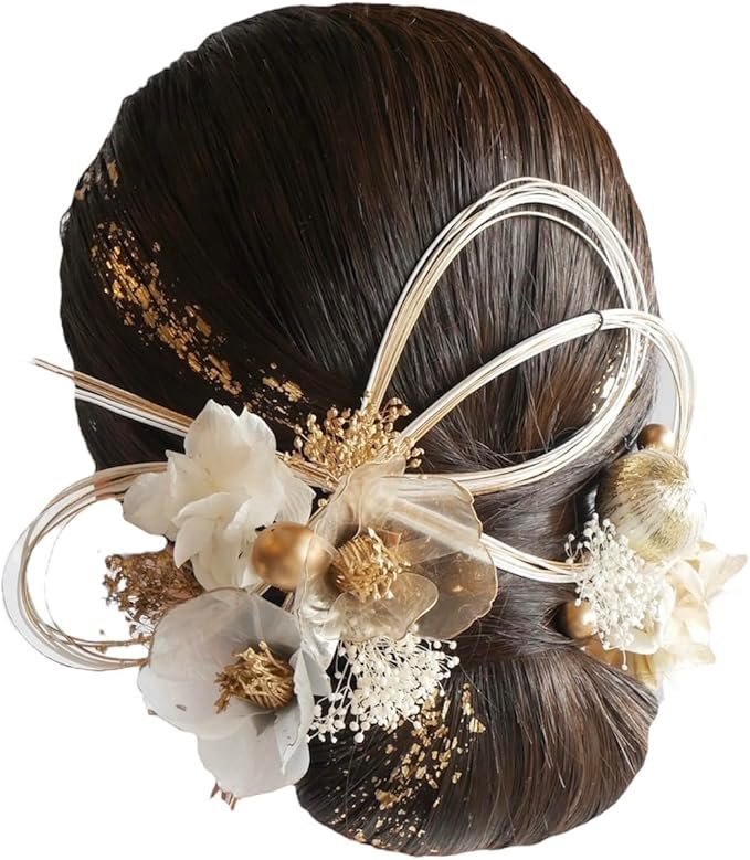 [Lomeri ロメリ] タイトヘア 髪飾り おかみさん ロメリ ドライフラワーの髪飾り 成人式 卒業式 結婚式 袴 G11(白ゴールド)
