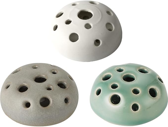 ✿仕様:半円形の針のない剣山、✿素材:陶器。✿プロセス:手作り剣山、素焼きセラミック。✿スタイル:ライトカラー3セット:ホワイト、グレー、青色。✿サイズ:直径 7.7cm高さ3cm。✿パッケージに含まれるもの:剣山*3。(クリーニング用ブラシが付属)