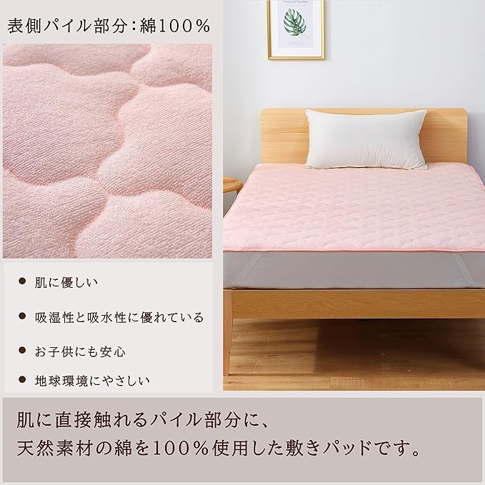 【綿100%生地】表側パイル部分:綿100% 表側グランド部分:ポリエステル100% 中綿:ポリエステル100%。お肌に直接触れるパイル部分に、天然素材の綿を100%使用した敷きパッドです。綿は吸湿性と吸水性に優れているため、ムレ感の原因になる湿気や汗をしっかり吸収・発散し、とっても快適。化学繊維にアレルギ一の出る方や、お子供にも安心、地球環境にも私達にもとってもやさしい天然素材です。