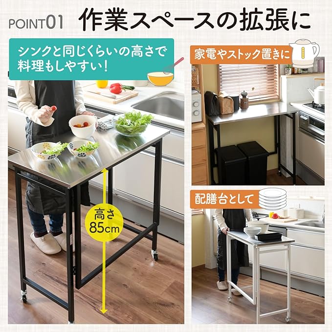 【作業のしやすい高さ設計】高さは85cmとキッチンカウンターと同じような高さになっているので、調理のときの補助台としても使いやすいです。