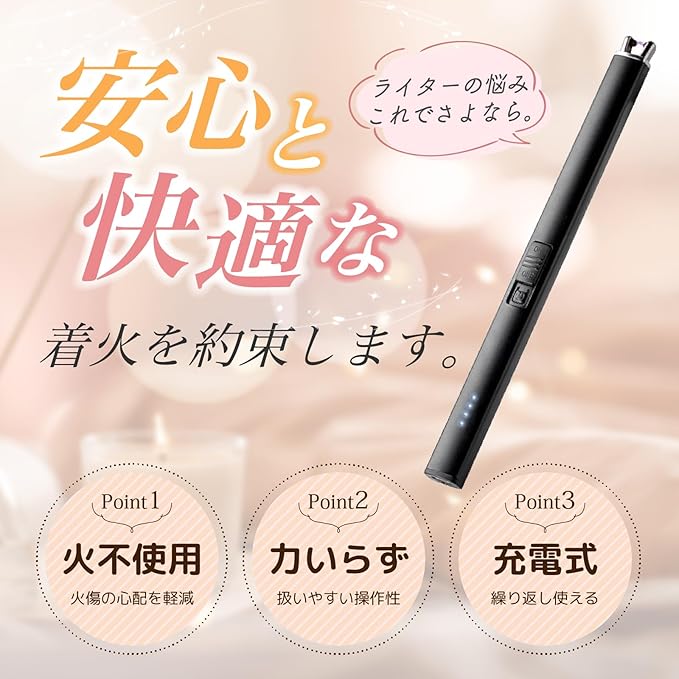 オイルがなくて点かない、といった心配はありません。汎用性の高いType-Cで充電可能で、いつでもどこでも手軽に使用できるように設計されています。