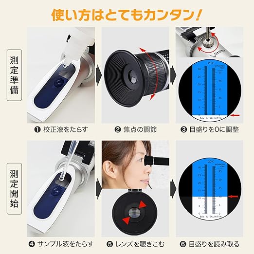 ✅【塩分・糖分どちらもOK】レンズ左側の糖度(BRIX)スケールでは高いブドウやバナナも含めすべての果物の糖度が測れます!右側の塩分濃度スケールでは25%までの塩分濃度が測定できます。調味料やスープは溶け込んでいる糖分/油分/塩分/たんぱく質/酸等を合計した濃度になります。配合割合や品質チェックの目訳にご利用ください。測定範囲を超える場合は希釈してください。