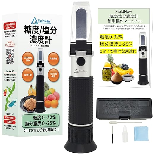 FieldNew 糖度計/塩分濃度計【塩分・糖度どちらもOK】 国内限定商品 日本語説明書・校正液付き 180日保証 国内品質検査済 温度自動補正 電池不要 屈折計