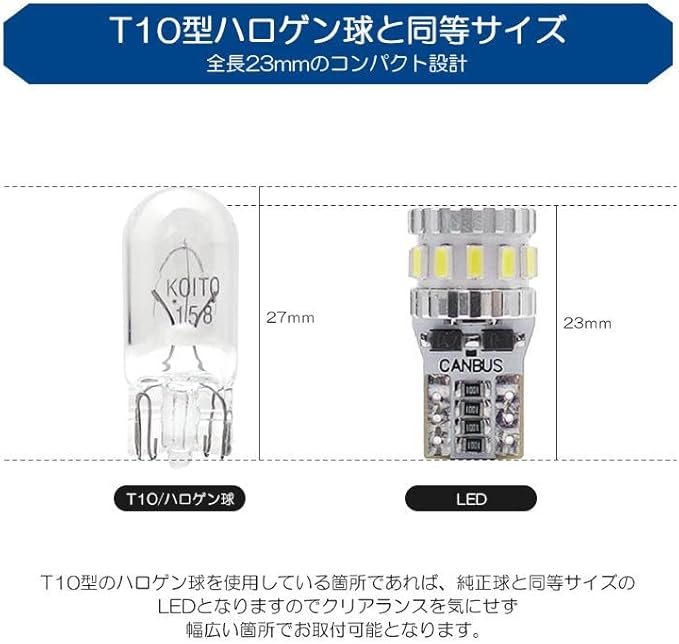 T10型のハロゲン球と同等サイズになりますので、形状が同じであればポジションランプ/ライセンスランプ/ルームランプ/カーテシランプなど幅広い箇所でお取付可能となります。
