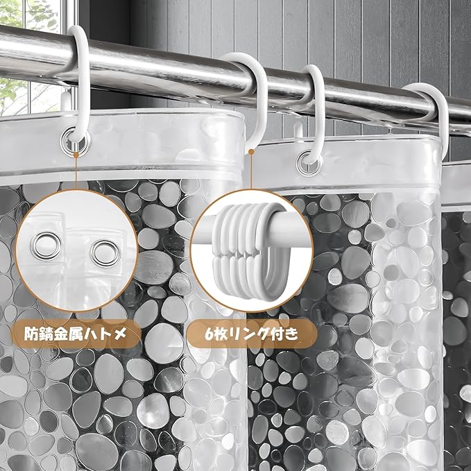【小石柄デザイン】ビニールカーテン表面には小石柄で目隠しでプライバシーを保護されます。シンプルな半透明シャワーカーテンなので、バスルームがいつも明るく見えます。