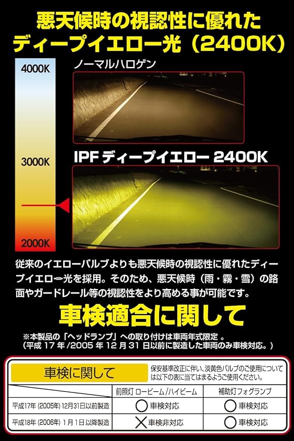 IPF ヘッドライト フォグランプ ハロゲン 車用 H4 2400K イエロー 黄色 12V用 2本入 車検対応 霧・雪・悪天候に強い XY43