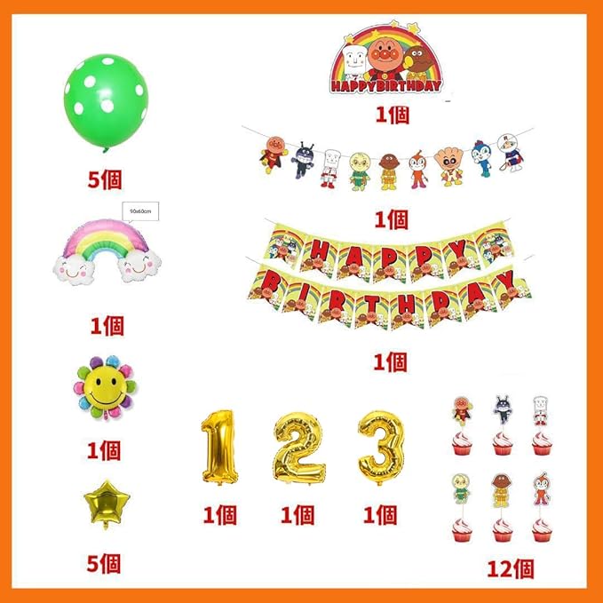 【アンパンマン誕生日セット 】 数字バルーン1歳、2歳、3歳セット1点、ハッピーバースデーバナー1点、アンパンマンキャラクターガーランド1点、小さいケーキトッパー12点、大きいケーキトッパー1点、カラフル風船5点、星バルーン5点、スマイルフラワーバルーン1点、レインボーバルーン1点、合計30セット