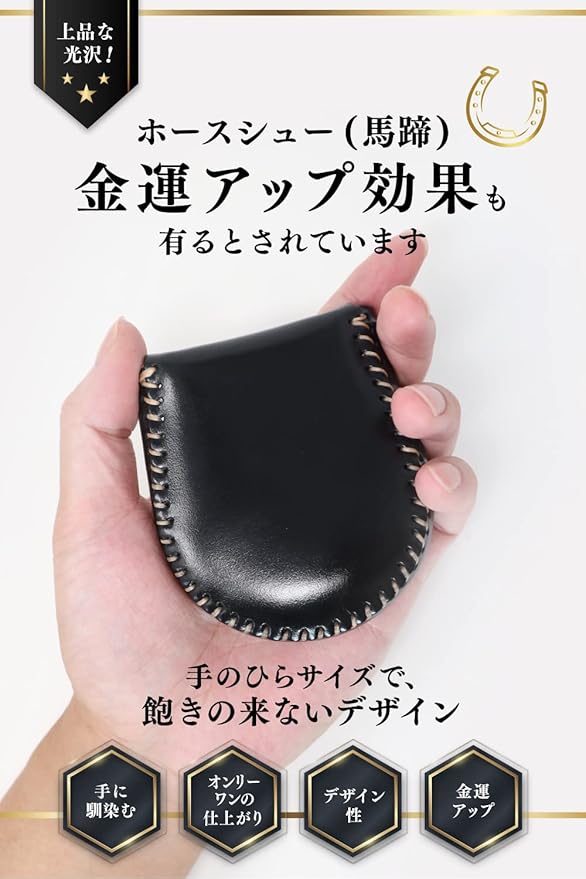 【シンプルなデザイン】毎日使って飽きの来ないデザイン。ビジネス・プライベート、年齢・性別を問わずご使用が出来き馬蹄型コインケースです。手のひららサイズで、光沢のある質感です。