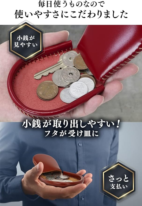 【驚きの使いやすさ】フタが受け皿となり、必要な小銭を取り出しやすく、スムーズに支払いを済ませることが出来ます。小銭を入れる際もフタの部分を斜めにすることでスムーズに小銭を入れることが出来ます。