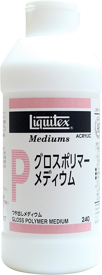 つや出しメディウムです。リキテックスカラーに混ぜると光沢と透明度が増します。絵具を水で薄めすぎると定着力が落ちるのでこのメディウムを少量混ぜて補います。速乾性。乳白色をしていますが乾くと透明になります。接着力が強いのでコラージュの接着剤にもなります。