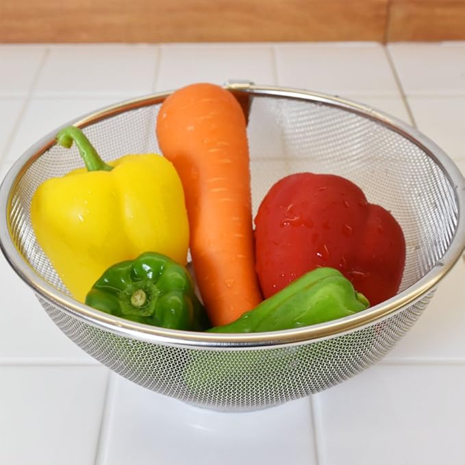 細かく切った野菜や果物などの水洗いや水切りに便利です。吊り下げて収納できるリング付。