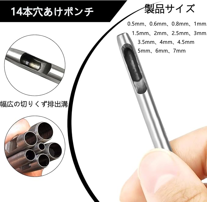 穴あけポンチ パンチ 穴あけポンチ ポンチセット 14本 0.5mm、0.6mm、0.8mm、1mm、1.5mm、2mm、2.5mm、3mm、3.5mm、4mm、4.5mm、5mm、6mm、7mm