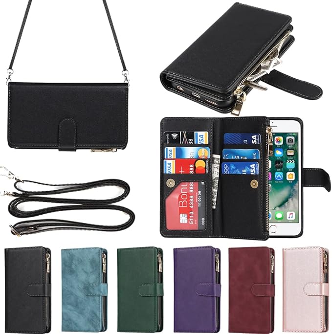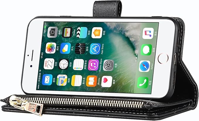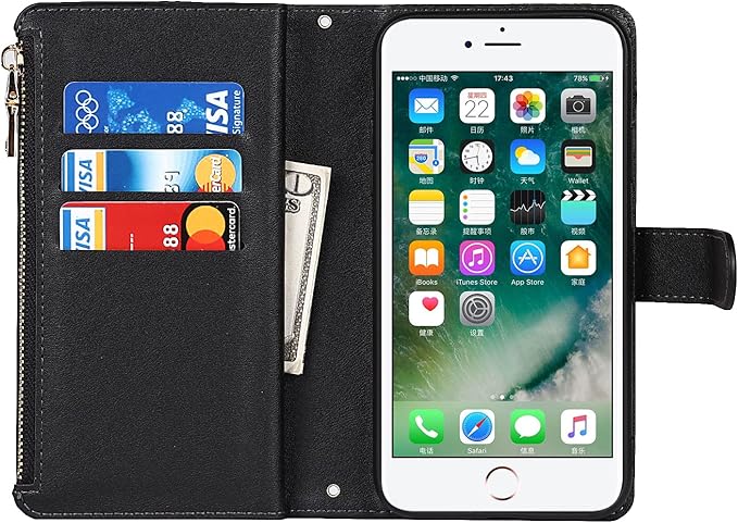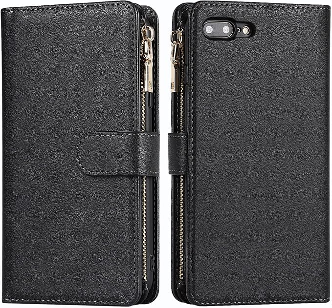 Eastwave アイフォン 8 Plus / 7 Plus ケース for iPhone 8plus / 7plus 縄掛けケース 手帳型 財布型 ICカード コインポケット ストラップ付き カード 収納 小銭入れ ファスナーポケット付き PUレザー 6色 ブラック