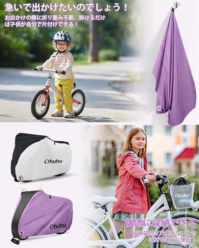 24インチまでの自転車に対応:立体裁断と絞りゴムより、風の侵入を防止、自転車をすっぽりと被せます。大きめサイズ:約170cm x 85cm x 60cm。20インチまでの自転車に対応。