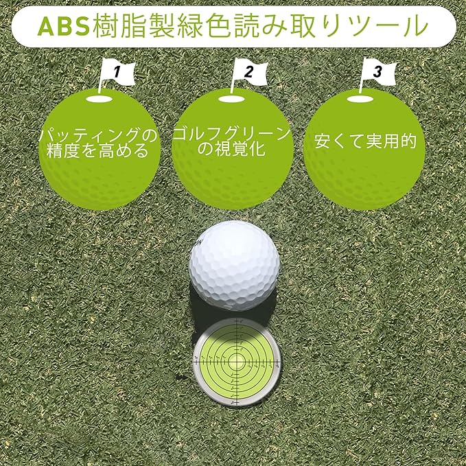 このゴルフマーカーは傾斜の調整方法を教えてくれます。平らだと思っていたら、少し傾斜があったというような場合に便利です。