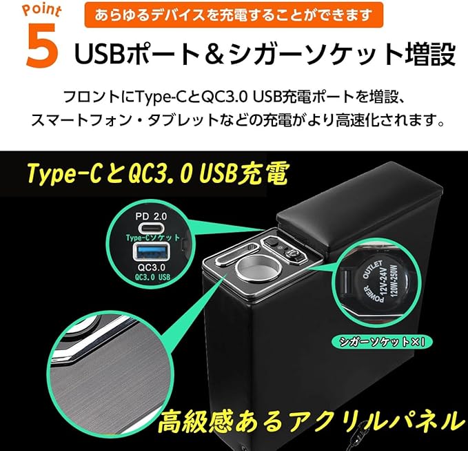 【高級感のあるデザイン】ルーミー コンソールボックスの表面は上質なレザー(合成合皮)を使用。摩擦に強く、汚れがつきにくいです。内側にソフトな素材を使用しているので騒音を軽減できます。コンソールボックス内部にLEDが付属し車内を煌びやかに演出します。