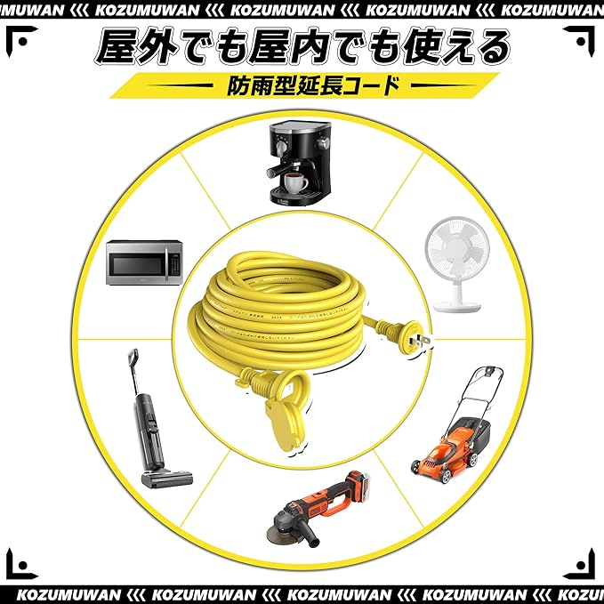 多用途防雨延長コード:イルミネーション、屋外配線、電動工具に最適な10m防水延長コード。特に設計された防雨キャップ付きで、庭園、パティオ、デッキ、プールサイドなどの屋外空間での照明や電動工具、屋外エンターテイメントシステムへの電力供給に便利です。特別デザインしました黄(いえろー)の延長コードは、用途に応じて選べ、視認性や美観を考慮した色彩設計がされています。