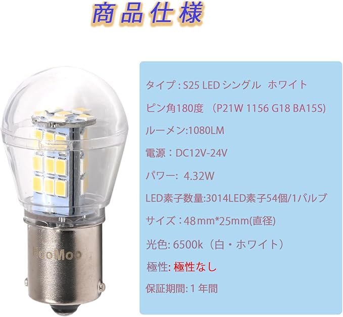 【 S25 LED シングル 】バックランプにおすすめ。シングル球、ピン角度180 ( BA15Sタイプ 12V21W対応)、ホワイト光、DC12V/24V対応可。