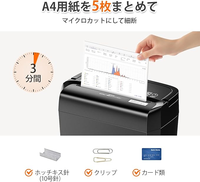 【強固なセキュリティ対策】機密性に優れた4 12mmマイクロクロスカットで、情報が読み取りにくく、重要情報の流出を防止します。クリップ、ホチキス針、カードもラクラク細断できます!