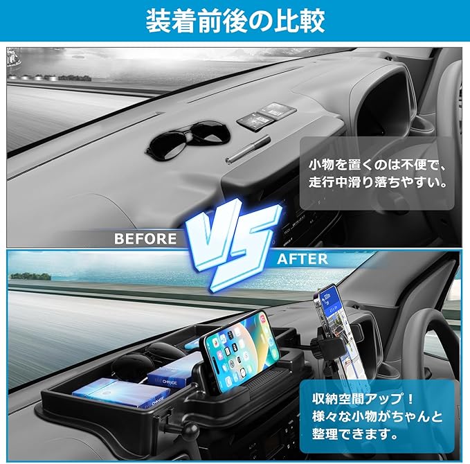 2.【素材】:本体:軽量かつ硬度が高いABS樹脂製 (耐高温) 、ラバーマット:環境にやさしいゴム(滑り止め加工済み)。運転中に小物があっちこっちに移動しにくくなり、フロントガラスへの反射も低減する効果が期待できます。【商品内容】:ダッシュボードトレイ本体*1、スマホホルダー*1、ボールジョイント*2、黒ラインゴムマット*2。