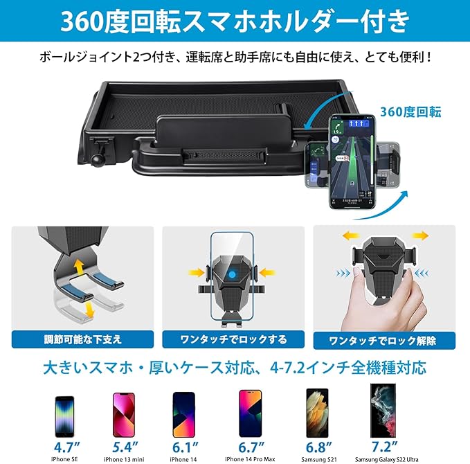 3.【360度回転スマホホルダー付き】:この商品は運転席用のスマホホルダーだけでなく、助手席用の360度回転ホルダーも追加され、スマホ本体を固定する部分は360度回転できます、ロングアームでレバー等の干渉を避け、見やすい位置へ調整可能できます。【幅広い機種対応】スマホホルダーはコンパクトと機能性を兼ね揃えた車載ホルダーで、 4-6インチのスマホに適用しています。iPhone 13 / 12 /11 promax/ iPhone XS MAX / iPhone 8 Plus / 7 Plus / 6 Plus、または Galaxy S8 Plus / huawei / Xiao Mi / Xperia / Google Pixelなどの機種に対応可能です。(※注意:11 Pro/ iPhone X / XS / XS/iPhone SE / SE 2/iPhone 8/iPhone 6/Galaxy S8などの機種に対応する可能ですが、スマホケースを装着しないスマホには、ご利用の場合、音量ボタンが押されてしまうかもしれません。ご了承ください。)
